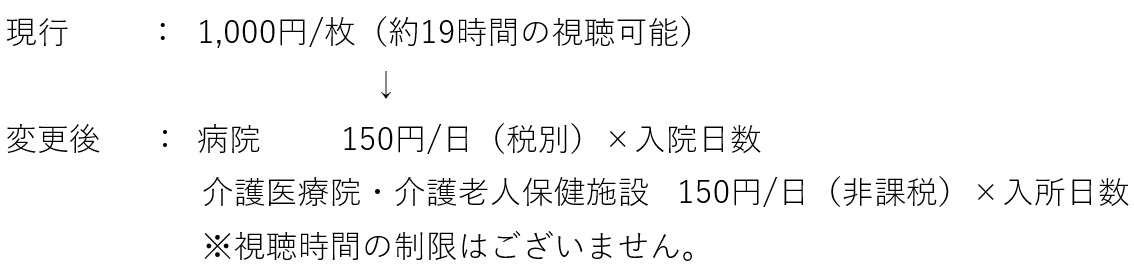 現在、病室でテレビを視聴する際はテレビカードを購入し利用して頂いておりますが、2025年7月31日をもってテレビカードを廃止し、2025年8月1日よりレンタルテレビ(定額料金制)へと変更させていただきます。